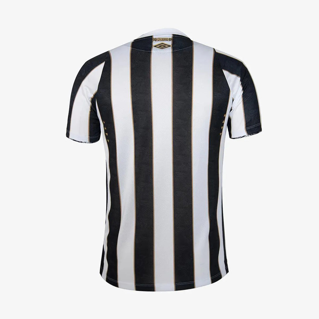 A nova camisa reserva do Santos para 2024/25 traz de volta o tradicional listrado preto e branco em um design moderno e cheio de personalidade. Com listras verticais detalhadas por finas linhas douradas, o manto carrega símbolos gráficos em alto relevo que homenageiam a história do Peixe. Na versão jogador, o modelo entrega leveza, caimento atlético e tecnologia de ponta, exatamente como usado pelos atletas em campo.